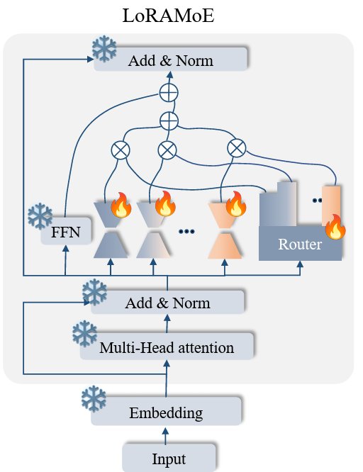 • 普通 Transformer 的 FFN 被换成 LoRA + MoE 专家网络